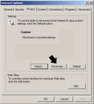 Step 1 - From the "Tools" section, select "Internet Options", then click the "Privacy" tab and select "Advanced" (shown below).